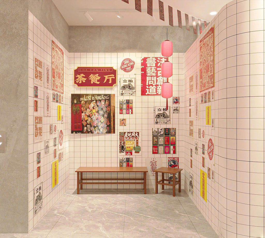 • Gạch ốp caro, tường poster cũ, biển hiệu chữ Hoa mang đậm tinh thần đường phố Hong Kong.