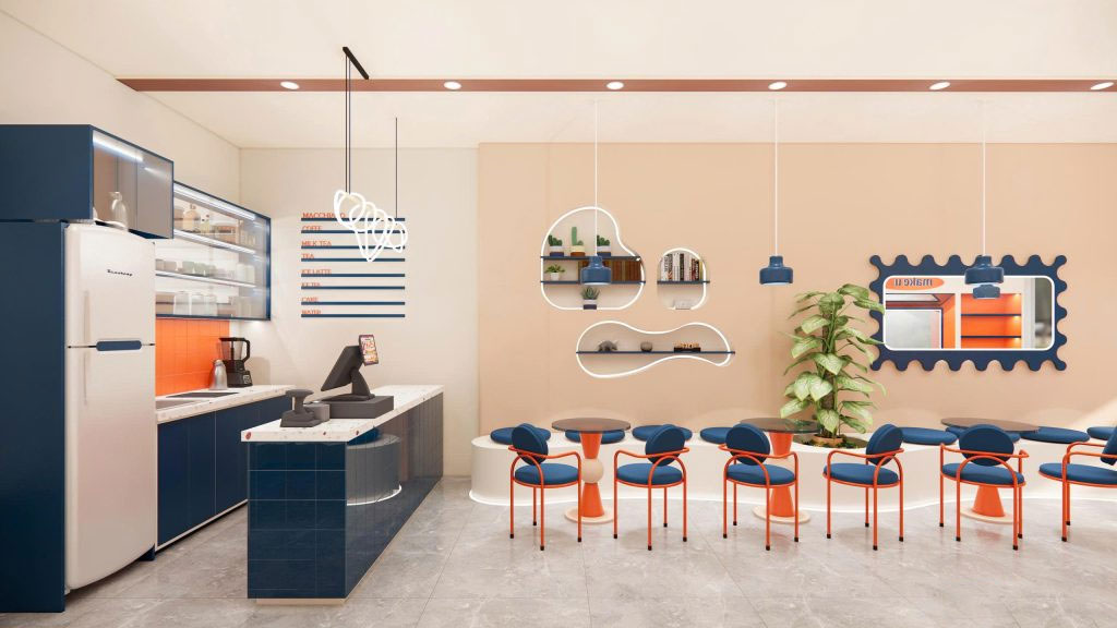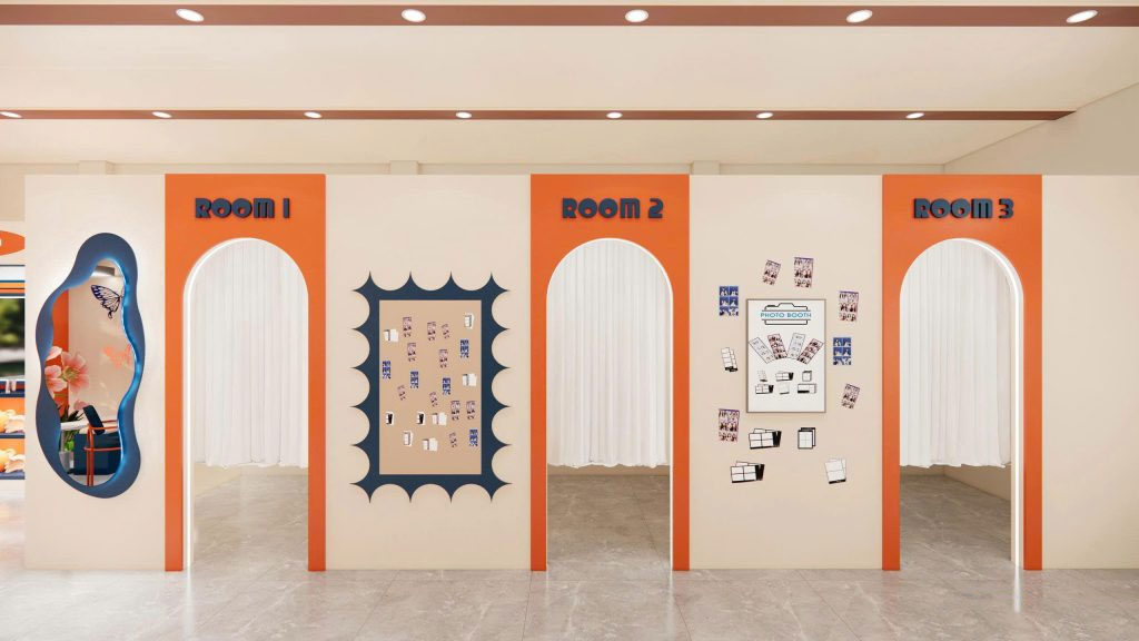 Không gian photobooth được đầu tư ánh sáng chuẩn studio cùng background đa dạng, phù hợp nhiều phong cách từ trẻ trung, dễ thương đến cá tính, sang chảnh. Khu chụp được bố trí hài hòa trong quán với gam màu cam – xanh hiện đại, tạo cảm giác năng động và cực kỳ bắt mắt khi lên hình.