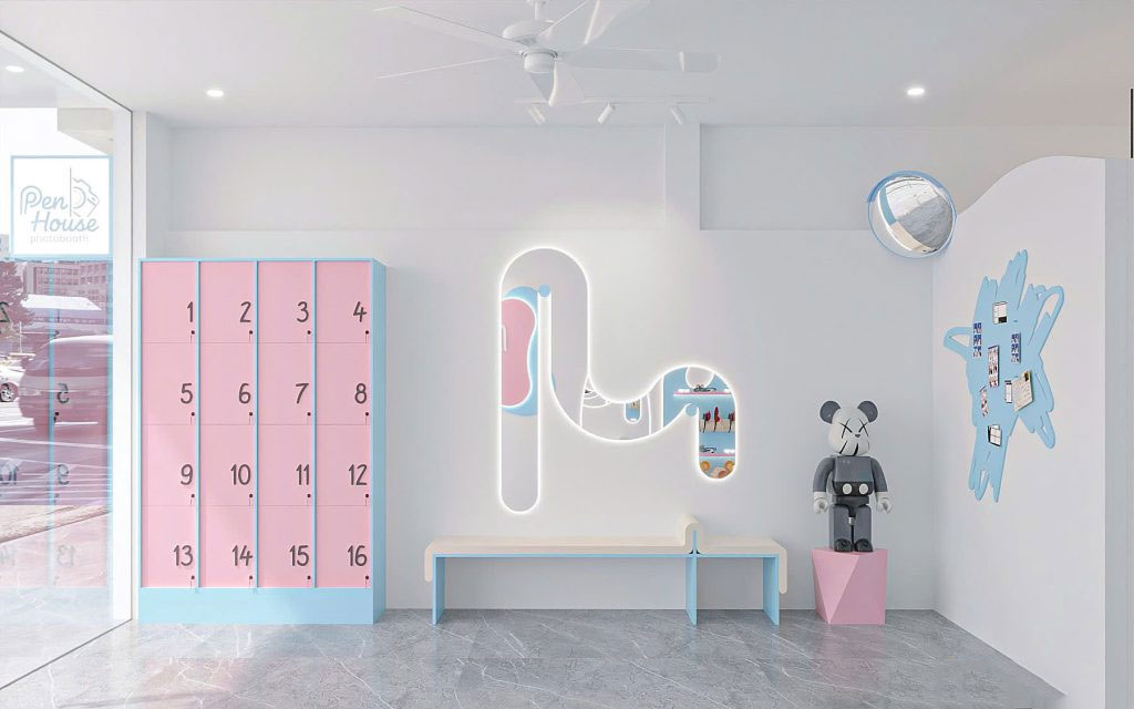 Lấy cảm hứng từ phong cách Hàn Quốc, Pen House được bố trí khoa học với locker tiện lợi, bàn trang điểm, kệ phụ kiện và các booth chụp ảnh sắp xếp liền mạch theo hành trình trải nghiệm. Những chi tiết décor như gương viền LED, tường dán ảnh và hệ ánh sáng trắng trung tính giúp tôn da, làm nổi bật outfit và tạo nên những khung hình trong trẻo, tinh tế.