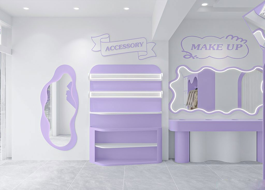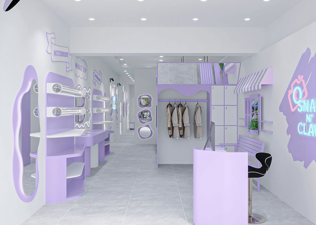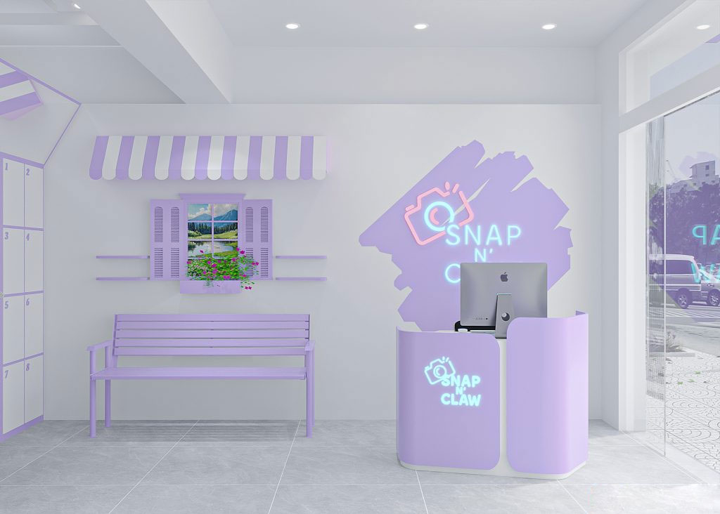 Thiết kế bên trong được trau chuốt từ quầy lễ tân bo cong sắc tím, khu makeup gọn gàng cho đến bảng hiệu neon “Snap’n Claw” rực rỡ – góc check-in mà ai đến cũng phải dừng lại chụp một tấm.